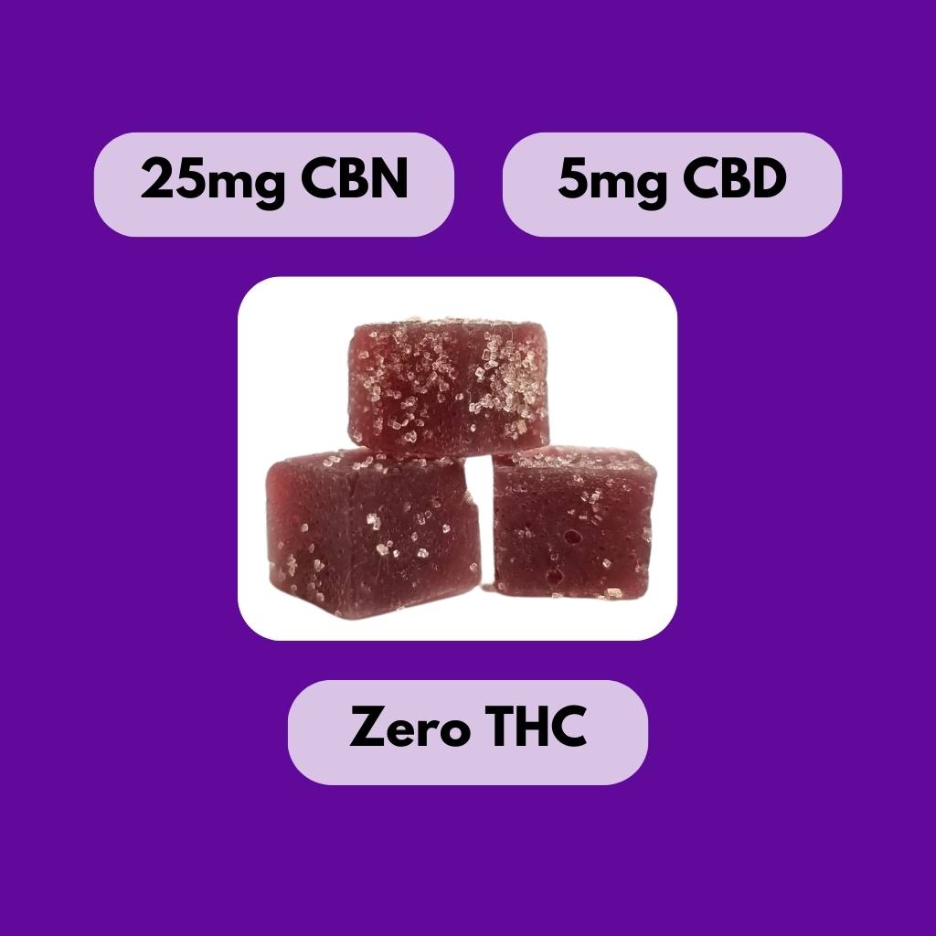25mg CBN Isolate, 5mg Full Spectrum CBD Oil, Organic Tapioca Syrup, Organic Cane Sugar, Water, Pectin; Less than 2% of: Natural Flavors, Color (Elderberry Juice, Spirulina), Citric Acid, Sodium Citrate.